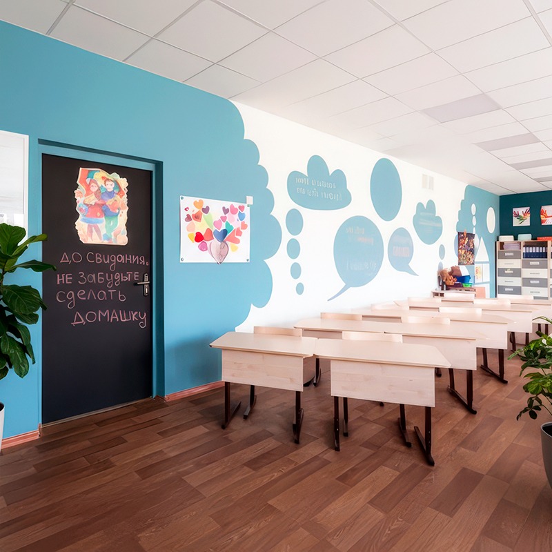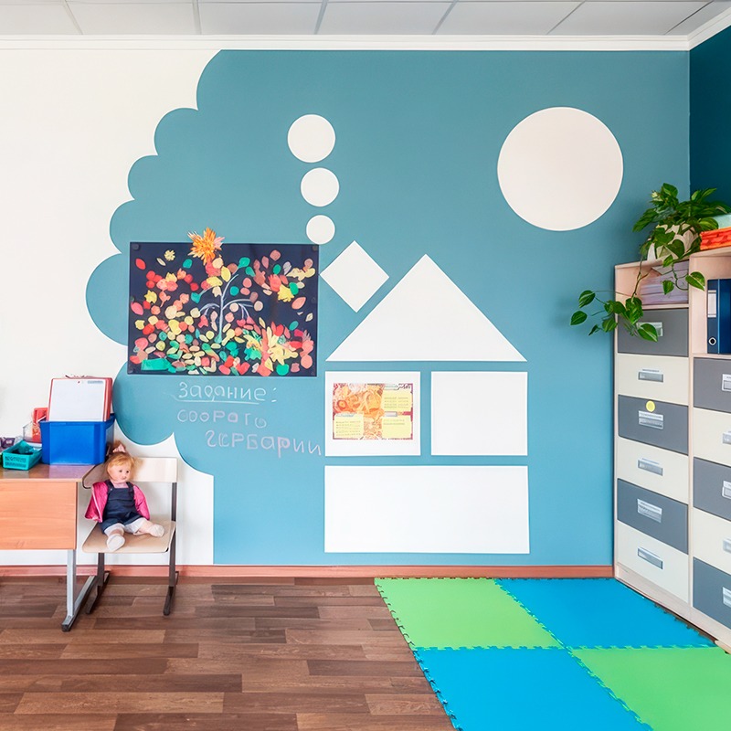 Ярко, стильно, функционально — разные оттенки покрытия сделали пространство светлее и уютнее, а стена превратилась из фона в инструмент обучения.